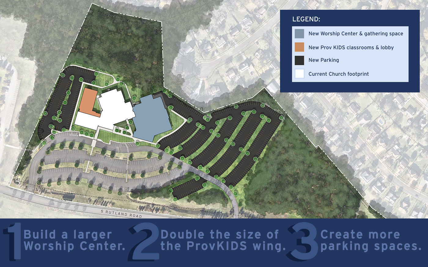 With growth, there have been challenges. Our 800-seat worship center struggles to accommodate the number of people who attend each week, particularly at the 9:30 service. On a typical Sunday morning, every parking spot is occupied, and an additional 40 to 50 vehicles are parked in the driveway and on the grass. Lines of cars stretch in both directions on S. Rutland Road as families wait to enter the parking lot. We have seen families pull into the lot, circle around, and drive away because they couldn’t find a parking space.